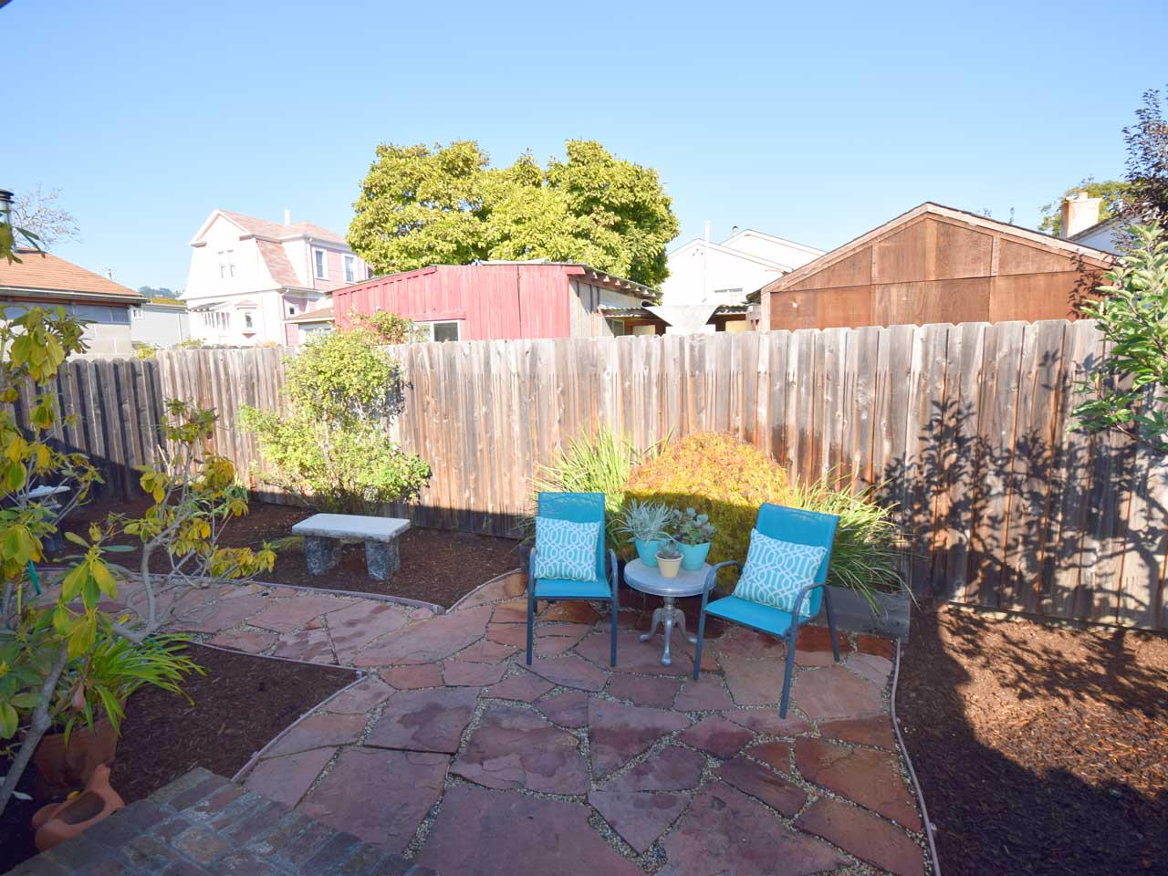 Attached two-car garage and storage galore. Botanical setting includes apple and lemon trees, roses and birds of paradise. Only 30 minutes from your door to Embarcadero Station!